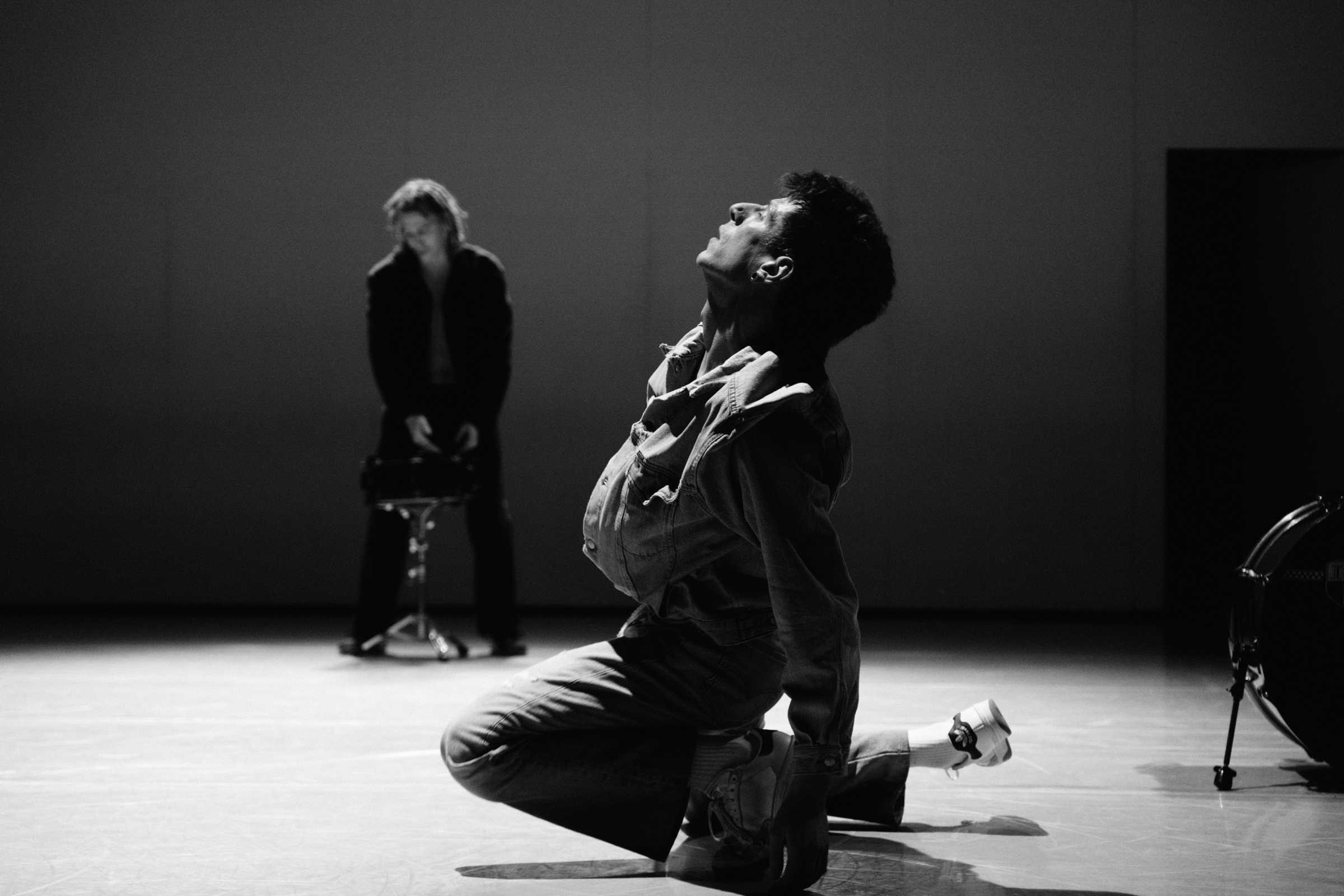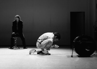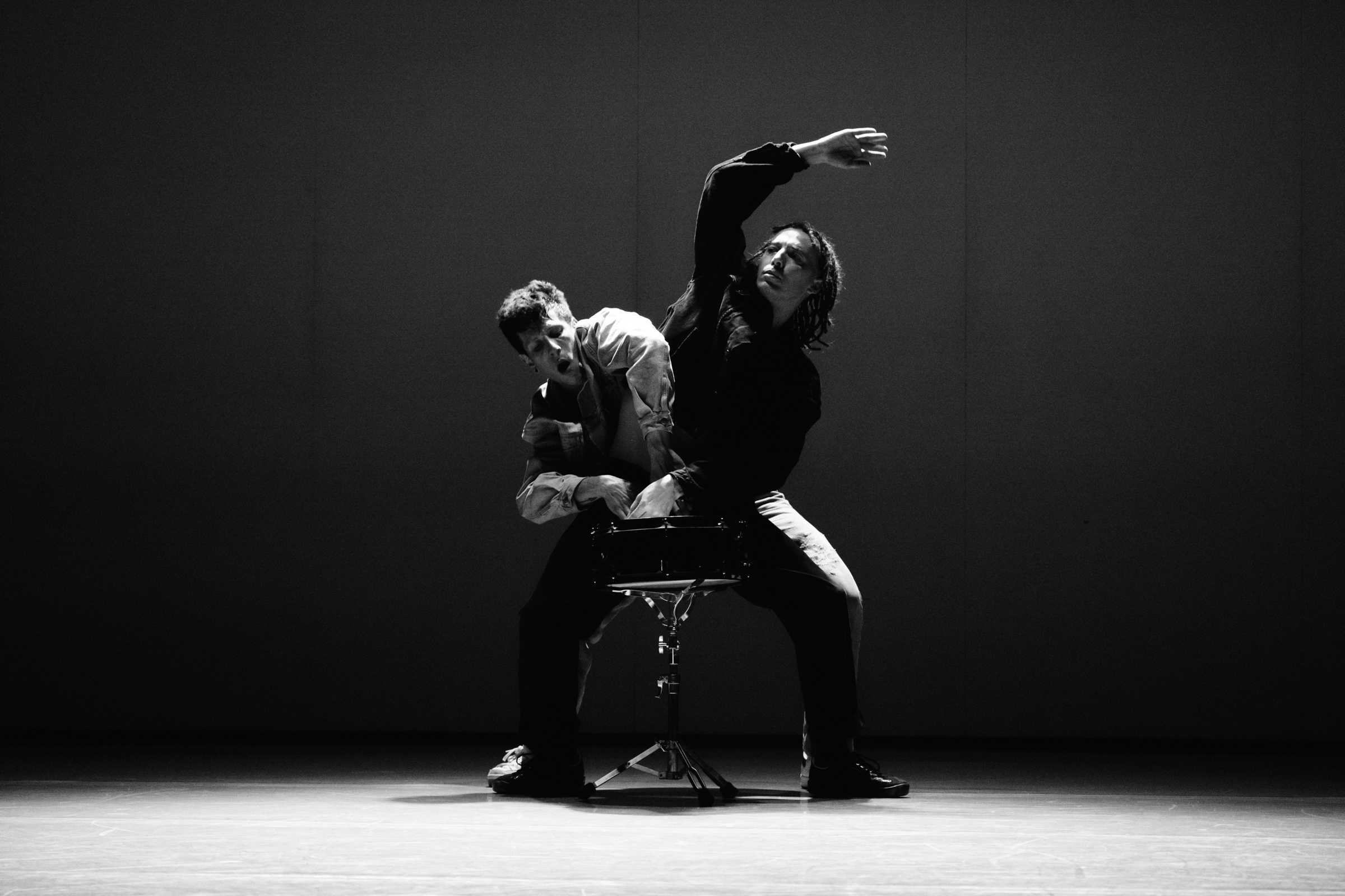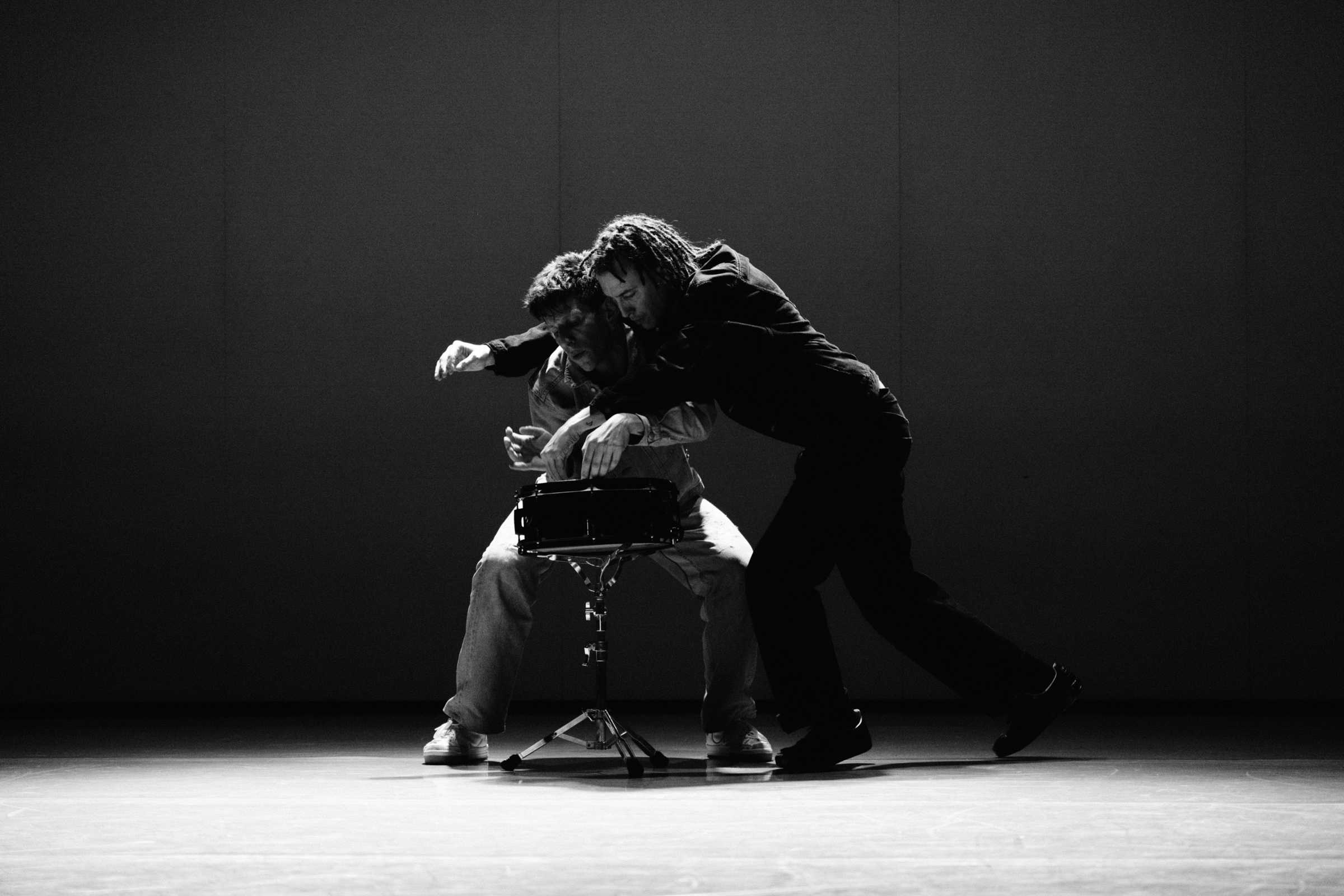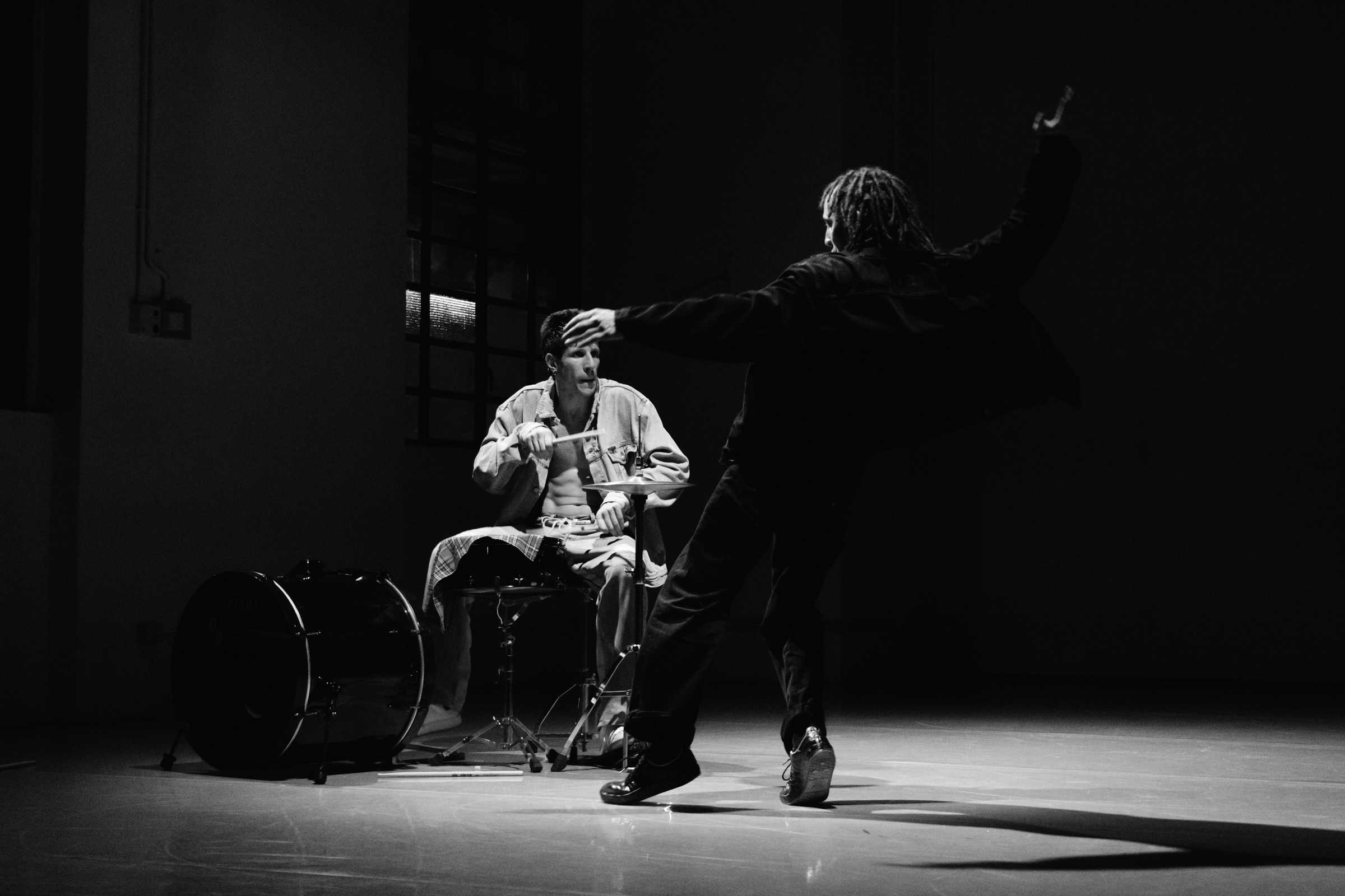 Due danzatori si confrontano con una batteria scomposta.
